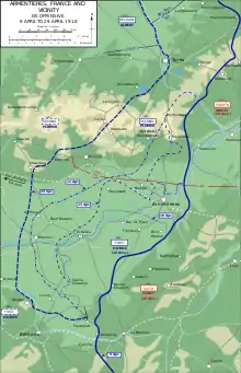 The assault began on 9 April, with the division, 149th and 151st Brigades in the front line, relieving the 14th (Light) Division on 11 April, immediately east of Wancourt, flanked by the 56th (on the right) and 3rd Divisions. On 14 April the 151st brigade advanced to capture high ground East of Héninel and a height, the site of Wancourt Tower which had collapsed on 13 April. Fighting would continue around the height, until it was captured by the 7th Northumberland Fusiliers on 17 April.[84]