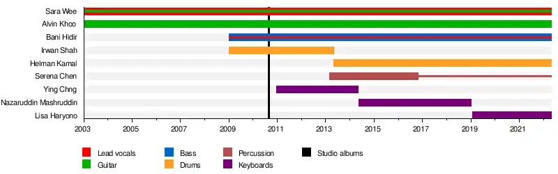 In December 2010, Chng Hui Ying, better known as Ying Chng, joined the band on keyboards. In May 2011, Serena Chen joined the band as a percussionist. She became a permanent member the band in March 2013. Irwan Shah left the band in May 2013 to focus more on his career as a music examiner, and was replaced by Helman Kamal.