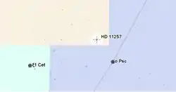 54 Ceti is an older Flamsteed designation[9] for a star that is now located within the constellation boundaries of Aries,[10] the Ram. In the present day it is known by star catalogue identifiers like HD 11257 or HR 534.[8] At an apparent visual magnitude of 5.94,[2] it can be seen with the naked eye. The distance to this star, as determined using parallax measurements made during the Hipparcos mission, is approximately 139 light-years (43 parsecs), give or take a 6 light-year margin of error.[11] It is located near the ecliptic and hence is subject to occasional occultation by the Moon.[12]