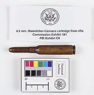 The cartridge was identified by the Warren Commission as the round used in a World War II-surplus Italian 1891 Carcano (Fucile di Fanteria Mod. 91/38) rifle used by Lee Harvey Oswald at the Texas School Book Depository to assassinate United States President John F. Kennedy at Dealey Plaza in Dallas, Texas on November 22, 1963.