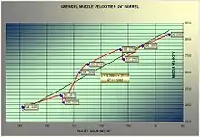 As noted above, the Grendel case is very closely related to the .220 Russian case. In general, each additional grain of bullet weight will reduce muzzle velocity by 10.8 ft/s (50.8 m/s for each gram) and each additional inch of barrel length will increase muzzle velocity by 20 ft/s (2.4 m/s for each centimeter). Specific details are available as graphs derived from Alexander Arms' public domain load table linked below.