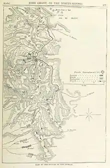 It was during this action that Pte. John Byrne and Sgt. Daniel Dwyer returned to this ravine to rescue wounded comrades, which would lead both to be recommended for the Victoria Cross, and Byrne to receive it.[110] With this cover, the regiment was reorganised with the rest of the brigade and other stragglers, including Guardsmen, and were then deployed to 'The Barrier' in front of Home Hill for the rest of the battle.[111] The losses for the day were 69 men killed, wounded or missing.[112]