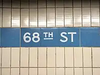 Both platforms have their original brown and yellow mosaic trim line with "68" friezes on it at regular intervals. Where some tiles have degraded and fallen off, the wall is painted in matching colors. Below the trim line are mosaic name tablets reading "68TH STREET-HUNTER COLLEGE" broken onto two lines in white seriffed lettering on blue with a gold and green border.[33] On small sections of the platforms on either ends, where they were extended in the 1950s, there are blue trim lines with "68TH ST" white lettering printed on them.[34] Midnight blue I-beam columns run along both platforms at regular intervals with alternating ones having the standard black station name plate in white lettering.[35] Both platforms have emergency exits from the lower level express tracks.