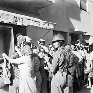 Operation Agatha started at 04:15 on 29 June. The 2nd Parachute Brigade was responsible for Tel Aviv, the 1st Parachute Brigade for Jewish settlements around Ma'abarot and the 3rd Parachute Brigade for those around Givat Brenner.[42] The operation ended on 1 July after 2,718 suspects had been arrested. Many had no connection to the resistance movements and were instead arrested for harassing the searchers or for refusing to give their names when asked.[43] The 6th Airborne Division alone arrested 636 persons, 135 of them for being suspected Palmach members and ten were Jewish leaders.[44]