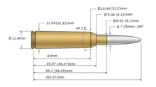 The 7×54mm Finnish is a rifle cartridge which was designed by Lapua as a moose hunting cartridge.[1] It was loaded by two factories, Sako and Lapua in Finland from about 1944 until 1974.[1] It is a 6.5×55mm SE necked up to take a 7mm (.285) bullet. It may be loaded with modified 6.5×55mm SE dies drilled to fit an 8mm neck diameter. It was usually loaded with a lightweight bullet.