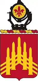 A Gold color metal and enamel device 1 1/8 inches (2.86 cm) in height overall blazoned as follows: Gules, five high explosive projectiles palewise in chevron surmounted by three chevronels Or. Attached below and to the sides of the insignia a Gold scroll inscribed "UNDIQUE VENIMUS" in Black letters.