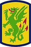 • Shoulder patch: An escutcheon with a red field and a blue chief, separated by an olive drab line; a three-pronged white device is superimposed on the blue chief.