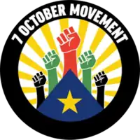 The 7 October Movementa is a South Sudanese opposition group founded by Kerbino Wol Agok. Wol, a businessman and philanthropist, was detained by the National Security Service without a charge in April 2018. He started a riot in the National Security Headquarters, or Blue House, on October 7, 2018, from which the group gets its name, and was sentenced to 10 years in prison. However, he was pardoned by president Salva Kiir in January 2020.[2] Wol announced that he had founded the movement on June 5, 2020, and at that time claimed to have 1,000 men in the rural areas of South Sudan.[1] Wol claimed that many members of the movement fought under John Garang in the Second Sudanese Civil War, and also that many of them had been prisoners in the Blue House. The group is opposed to the current leadership, which the 7 October Movement believes have kept South Sudan in poverty, as well as the National Security Service and the current prison system, which the group believes is unjust.[3]