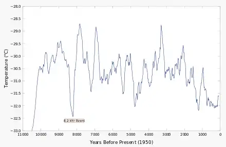 In climatology, the so-called "8.2-kiloyear event" was a sudden decrease in global temperatures that occurred approximately 8,200 years "BP", or c. 6,200 BC. It defines the start of the Northgrippian age in the Holocene epoch. Milder than the Younger Dryas cold period before it but more severe than the Little Ice Age after it, the 8.2-kiloyear cooling was a significant exception to general trends of the Holocene climatic optimum. During the event, atmospheric methane concentration decreased by 80 ppb, an emission reduction of 15%, by cooling and drying at a hemispheric scale.[2]