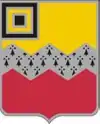 • Symbolism- The dual character of the regiment is shown by the colors of the field, yellow for cavalry, red for artillery. The fess dancetté is taken from the arms of the Oglethorpe family, also the boar's head crest, which in addition is the ancient symbol of hospitality. The arms of ancient Brittany was a shield of ermine, and ermine figures prominently in the arms of Vannes; this is shown by the tincture of the fess. The parent organization is shown on the canton.