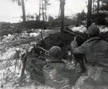 The last drive began on 23 April. The 99th crossed the Ludwig Canal against stiff resistance and established a bridgehead over the Altmuhl River, 25 April. The division crossed the Danube near Eining on the 27th and after a stubborn fight the Isar at Landshut on 1 May. On 3-4 May, the division liberated two labor camps and a "forest camp" (Waldlager) related to the Mühldorf concentration camp, a sub camp of Dachau.[12] The 99th Infantry's after action report stated they found 1,500 Jews "living under terrible conditions and approximately 600 required hospitalization due to starvation and disease."[13] The division continued to attack without opposition to the Inn River and Giesenhausen until VE-day.