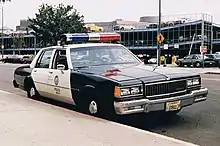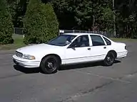 The eighth generation W body Impala was powered by the 3.8L Buick V6 engine. The 3.8L V6 was mated to a heavy duty four-speed 4T65-E HD transmission and made 200 horsepower at 5,200 rpm and 200 lb-ft of torque at 4,000 rpm.[4] Mechanically, the 8th generation 9C1 featured many upgrades over the standard Impala including auxiliary oil coolers for the engine oil, power steering, and transmission, a heavy duty radiator with heavy duty fans and extended life coolant, heavy duty front struts, heavy duty shock absorbers, police calibrated brakes, heavy duty front brake pads, and a 125 amp alternator. The 8th generation 9C1 had a 0-60 time of 9.2 seconds and a top speed of 124 mph. Also, traction control was not available on the 9C1. The interior featured several features not available on civilian Impalas including stab-proof front seatbacks, heavy duty front seats, a 100 amp auxiliary power point in the trunk, and "Surveillance Mode"; which was a button that disabled all interior lights to allow officers to hide themselves better. The 9C1 featured a standard AM/FM radio, standard dual zone climate control, a standard driver side torso airbag (2005), and lockout protection; which prevents the driver from locking the keys in the ignition in the event someone tries to lock the doors.[5] This generation 9C1 was very popular with large inner-city departments such as the NYPD.