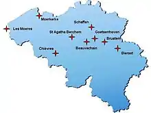 ![]() A map of Belgium, locating the airfields on which 9th Squadron was stationed |