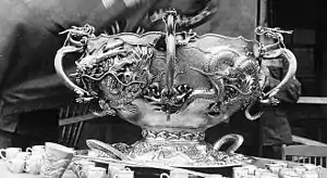 Colonel Liscum's dying words gave the regiment its motto, "Keep up the Fire." Lt. Col. Charles A. Coolidge assumed command, the Allies then captured the city. Additionally, the 9th Regiment saved millions of dollars worth of silver from being looted from a government mint. In a show of gratitude from the Chinese government, the regiment was awarded two silver ingots from which the Liscum Bowl was created.[7] The regiment fought in the Battle of Yangcun.
