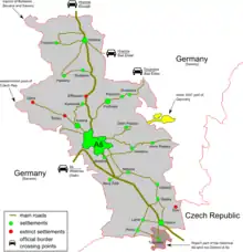 Previously uninhabited hills and swamps, the town of Asch was founded in the early 11th century by German colonists[2] descending from the Bavarian march of the Nordgau in the course of the Ostsiedlung. So far, previous Slavic settlements in the area are not known.[3] Similar to the Egerland region, the dialect spoken in the town was that of the Upper Palatinate region in the south, also known as Northern Bavarian. In the adjacent Saxon Vogtlandkreis to the east, this dialect is only found in localities close to the Czech border, such as Adorf and Markneukirchen. The Upper Palatinate dialect has a stronger presence in the Bad Brambach area, where it is known as Southern Vogtlandic (Südvogtländisch).