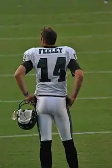Feeley was selected in the fifth round with the 155th overall pick of the 2001 NFL Draft by the Philadelphia Eagles.[6] He spent his rookie year in Philadelphia as the third-string quarterback, backing up Donovan McNabb and Koy Detmer. In the season finale of his rookie season, Feeley came off the bench in the fourth quarter and threw two touchdown passes in a 26-second span to bring Philadelphia back from a 13–3 deficit, and win the game by a score of 17–13.[7]