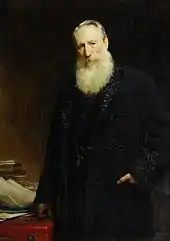 - Portrait in oil: by Sir Arthur Stockdale Cope RA (1857–1940). Painted on commission for the citizens of Sheffield to celebrate Mundella's 25th anniversary as an MP. A three-quarter length portrayal of Mundella as President of the Board of Trade with his hand resting on a departmental despatch box. The Sheffield Telegraph commented: "His face wears a somewhat sad and serious expression, and the artist has given him the full measure of his years".[57] The artist was Mundella's own choice. The painting was exhibited at the Royal Academy of Arts in London in the spring of 1894 and presented to Mundella on 11 Dec 1894 before being given to Sheffield Town Council.[58] It is on loan to Sheffield Galleries and Museums Trust.[45]