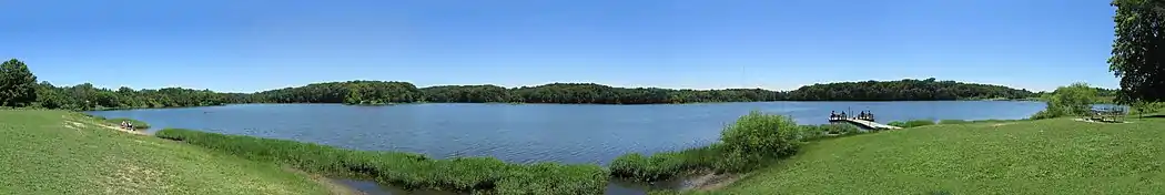 Boats with electric motors and rowing boats are allowed on the 145-acre (59 ha) lake. The lake is stocked with largemouth bass, muskellunge, bluegill and channel catfish.[2]