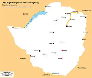 A11 Highway is a national road in Zimbabwe, running from Harare to Bindura through to Mount Darwin.[1][2] It is also the P1 Road, Zimbabwe primary road number 1.