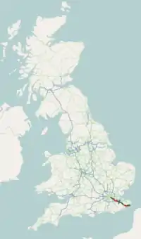| A2 A21 J1 → M20 motorway J3 → M25 motorway 2a J2a → M26 motorway A25 J5 → M20 motorway A26 J8 → M20 motorway A28 J10 → M20 motorway J11-J11a-J12 → M20 motorway J13 → M20 motorway A2 | |