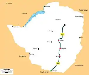 The A4 is a highway, also known as the R1 Highway, which runs between Beitbridge and Harare. From Beitbridge it passes through Rutenga, Ngundu, Masvingo, Mvuma, Chivhu before reaching Harare.