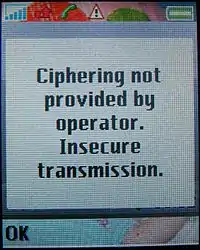 The message on the screen of a mobile phone with the warning about lack of ciphering