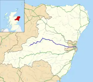 At a junction at Mossat, the A97 takes over as the northbound route towards Rhynie and on to Huntly. Following a section of 10 miles (16 km) as the A97 moving south-west passing Kildrummy Castle and Glenbuchat Castle, the roads split and the A944 carries on for a further 8 miles (13 km) before it eventually meets the A939 road to Tomintoul near Corgarff.