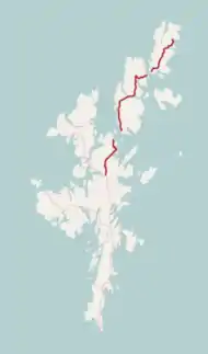 The A968 in Shetland is the United Kingdom's northernmost A-road.[1] It connects the islands of Yell and Unst[2] to the island of Mainland. The road is actually separated into three. The length of the part of the road on Mainland is 9.8 miles (15.8 km), on Yell 17.4 miles (28.0 km), and on Unst 10 miles (16 km). The road is marked red on most maps and goes from the A970 on Mainland to Haroldswick. It is 41.9 miles (67.4 km) long.