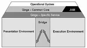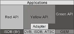 The standard addresses one of the main advances regarding the middleware specification, one of the Brazilian digital television system. The middleware specification comprises a procedural portion, performed by Java,[4] and a declarative portion, performed by NCL and Lua, with a bridge that allow for mutual access between them. The combined Brazilian middleware specification is called Ginga.