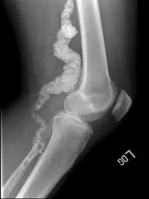 Arterial calcification due to deficiency of CD73 (ACDC) is a rare genetic disorder that causes calcium buildup in the arteries and joints of the hands and feet, and other areas below the waist.[1] Although patients exhibiting these symptoms have been identified as early as 1914, this disorder had not been studied extensively until recently. The identification of the specific ACDC gene and mutations occurred in 2011. ACDC is caused by a mutation in the NT5E gene, which prevents calcium-removing agents from functioning,.[1][2] Patients afflicted with this mutation suffer from chronic pain, difficulty moving, and increased risk of cardiovascular problems.[1][2] In experiments at the molecular level, treatment with adenosine or a phosphatase inhibitor reversed and prevented calcification, suggesting they could be used as possible treatment methods.[1] There is currently no cure for ACDC, and patients have limited treatment options which focus primarily on removal of blood calcium and improving mobility.[1][2]