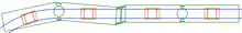 Adtranz low floor trams come in lengths of three or four modules, all of which are approximately the same length. Under each module lies a bogie; the low floor, however, constrains the bogie's movement. Two of the axles are mechanically linked to the bogie truck by means of a universal joint. Characteristic of this tram is its ability to follow curves, which requires a special track layout. This occurs when the first or last module drives through a curve and drags the other two modules (which are on the straight) after it.