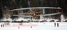 A small group of volunteers from the not-for-profit Aerial Experiment Association 2005 Inc. completed building a flying replica of the Silver Dart in early 2009. [5] The main goal of the group was to recreate the original flight on 23 February 2009 – again on the frozen surface of Baddeck Bay near Baddeck, Nova Scotia.[5] However, due to weather conditions forecast for the 23rd, the centennial flight and fly-by occurred on 22 February.[6] After a temporary repair made to the front wheel, former Canadian astronaut Bjarni Tryggvason piloted five successful flights that day.[7] The replica is officially considered a Canadian heritage project, and throughout the year was the centerpiece of a series of events celebrating the centennial of the Silver Dart's first flight in Canada.[7] In 2013, it was moved to the Alexander Graham Bell Museum in Baddeck, where it will be on permanent display.[8]