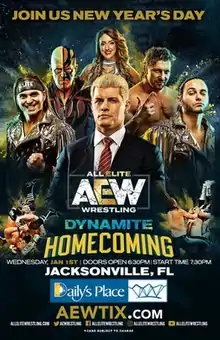 All Elite Wrestling (AEW) was founded in January 2019 and the company held its third-ever event, Fight for the Fallen, on July 13, 2019 at Daily's Place in Jacksonville, Florida.[1] Daily's Place is an open-air amphitheater located on the same complex as the TIAA Bank Field, the home stadium of the Jacksonville Jaguars, a National Football League team that is also owned by AEW President and Chief Executive Officer Tony Khan. As such, the stadium itself is AEW's de facto headquarters, with Daily's Place becoming AEW's home base. In October, AEW announced that they would be holding a special episode of their weekly television program, Dynamite, on January 1, 2020 at Daily's Place, and it would be titled Homecoming as a reference to the venue.[2]