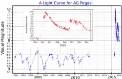 ![]() A visual band light curve for AG Pegasi. The inset plot shows the 2015 flare with an expanded time scale. Adapted Skopal from et al. (2012)[1] and Skopal et al. (2017)[2] | |