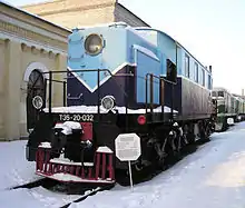 The Soviet-built TE1 (ТЭ1), initially designed TE1-20, was a reverse engineered copy of the Alco product, adapted to metric system and Soviet norms.[3] They were almost identical, but locomotives after #TE1-20-122 had 1050 mm (41.34 inch), instead of 40 inch wheels (1016 mm).[3] The designation meant T - teplovoz (diesel engine), E - electric transmission, model 1, 20 ton axle load.[3] A production lasted from 1947 until 1950 and 300 were made (including 2 of TE5 class).[3] The TE2 (ТЭ2) utilized engine and electric components of TE1, but was as a twin-unit version, with a wagon-type body and utilized two-axle bogies.[4] The TE5 (ТЭ5) was a cold climate version of the TE1. The cab was extended for most of the locomotive to provide covered access to the engine and a boiler was added to keep the cab warm when the engine was not running. [5] Only two (or five) TE5 were built, within TE1 series.[3]