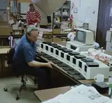 The CS6 Turbo II was also available in a version for use with automatic disk loaders, such as the Mountain Computer model 3200.[38] When using an automatic loader, blank disks are fed from a stack in a hopper, rather than manually placed into drives one at a time. The loader has two output bins, one for good copies and one for defective disks. Each Turbo II system could operate one or two automatic loaders.