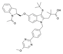 - Stock N, Baccei C, Bain G, Broadhead A, Chapman C, Darlington J, King C, Lee C, Li Y, Lorrain DS, Prodanovich P, Rong H, Santini A, Zunic J, Evans JF, Hutchinson JH, Prasit P (January 2010). "5-Lipoxygenase-activating protein inhibitors. Part 2: 3-{5-((S)-1-Acetyl-2,3-dihydro-1H-indol-2-ylmethoxy)-3-tert-butylsulfanyl-1-[4-(5-methoxy-pyrimidin-2-yl)-benzyl]-1H-indol-2-yl}-2,2-dimethyl-propionic acid (AM679)—a potent FLAP inhibitor". Bioorganic & Medicinal Chemistry Letters. 20 (1): 213–7. doi:10.1016/j.bmcl.2009.10.131. PMID 19914828.