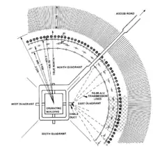 The AN/FRD-10 Circularly Disposed Antenna Array (CDAA) is a United States Navy circular "Wullenweber" antenna array, built at a number of locations during the cold war for high frequency radio direction finding (HF/DF) and signals intelligence. In the Joint Electronics Type Designation System, FRD stands for fixed ground, radio, direction finding. 14 sites were originally constructed as a part of the "Classic Bullseye" program.[2][3] Two AN/FRD-10 systems were later installed in Canada. AN/FRD-10 systems were originally constructed in the early 1960s, but after the dissolution of the Soviet Union, the systems began to be shut down and demolished. The Naval Security Group operated and maintained the U.S. Navy AN/FRD-10 systems. The system had several nicknames including Fred-10 and Elephant or Dinosaur cages.[4] As of 2015, none of the US Navy AN/FRD-10 sites are extant, but the two Canadian sites remain in service. The AN/FLR-9 was a system with a similar design and function, but operated by the US Air Force and Army.