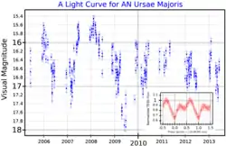 ![]() A light curve for AN Ursae Majoris. The main plot (from Catalina Sky Survey data[1]) shows the long term variation, and the inset plot (from TESS data[2]) shows the variation over the orbital period. | |