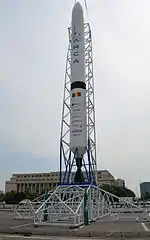 Haas 2C was to be an orbital rocket intended for commercial payload launches. There were two planned variants of the rocket, a single stage to orbit variant capable of placing a 50 kg (110 lb) payload into orbit and a two-stage variant capable of lifting a 400 kg (880 lb) payload into orbit. After testing the extremely lightweight composite tank, ARCA designed a single stage 18 m (59 ft 1 in) long rocket with a total weight of 510 kg (1,120 lb), having a thrust-to-weight ratio of 26:1 and a 50 kg (110 lb) payload.[18] The company displayed the rocket in Victoria Square in Bucharest, in front of the Romanian Government building.[20] The second stage version was to be powered by the Executor engine for the lower stage, and the upper stage use a smaller engine adapted for vacuum, named Venator.[34][35]
