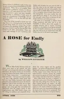 "A Rose for Emily" is a short story by American author William Faulkner, first published on April 30, 1930, in an issue of The Forum. The story takes place in Faulkner's fictional Jefferson, Mississippi, in the equally fictional county of Yoknapatawpha. It was Faulkner's first short story published in a national magazine.[1]