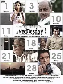 A Wednesday! is a 2008 Indian Hindi-language thriller film written and directed by Neeraj Pandey and produced by Ronnie Screwvala, Anjum Rizvi and Shital Bhatia under UTV Motion Pictures and Friday Filmworks.[2] Though a work of fiction, the script is partly inspired by the 11 July 2006 Mumbai train bombings. Naseeruddin Shah and Anupam Kher, the only choices for the lead roles, star respectively as people on either sides of the system. Set between 2 pm and 6 pm on a Wednesday,[3] the film depicts an about-to-retire police commissioner narrating a sequence of events that unfolded on a particular Wednesday. There does not exist any written record, as the awareness of the incident exists only in his mind and in those of several individuals who were involved, willingly and unwillingly, and how those events affected the lives of all the concerned people. It later inspired the Tamil and Telugu simultaneously made films Unnaipol Oruvan and Eeenadu (both 2009), and the Sri Lankan English film A Common Man (2013).
