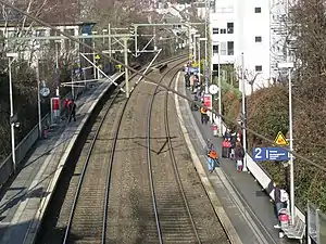 Aachen Schanz station is a railway station in Aachen, Germany on the railway line Aachen–Mönchengladbach. The station is located at the western end of the inner city, and is the station with the shortest walking distance to the historic center or the Aachen Cathedral. Several bus lines to western Aachen stop here, including regional buses to Kelmis and Maastricht and the medical centers of the city (Luisenhospital, Franziskushospital, Alexianerkrankenhaus and Klinikum Aachen). It is not a bus hub, but some lines stop at the southern end (Jakobstraße) and some at the northern end (Vaalser Straße), depending on the route of the line.