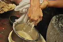 Traditionally, people of tulunadu used to clean the surroundings of paale mara the previous day of new moon day and tie the tree with rope dry banana leaves and keep a stone under the tree. So, they can identify the paale mara easily in the early morning and pray with the tree, "Hey divine Tree, you fill with the entire medicinal aspects tomorrow. Please bless with good health after having your bark/skin".[3] It also has divine status in this region. On aati amaase day, (the next day) before sunrise the bark/skin of the paale mara should be collected with the help of a stone and decoction prepared from it. The special care should be taken in the identification of the tree. Very outer skin(black coloured) is removed and inner white part is crushed by adding a little water, to make kashaya. The tree bark is grinded by using a stone.[4] And this ayurvedic concoction is prepared by mixing ingredients of pepper, turmeric, ajwain, garlic, and seeds into it. And scorch a pebble or iron bar and place in the decoction. After oblation to god and finally people intake the Kashaya. It tastes highly bitter, because it has ensemble medicinal contents. This juice is called Paaleda kashaya.[5]