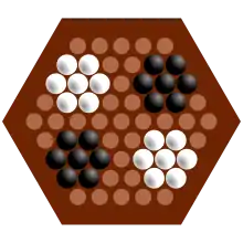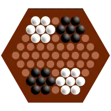 A player can push their opponent's marbles (a "sumito") that are in a line to their own with an in-line move only. They can only push if the pushing line has more marbles than the pushed line (three can push one or two; two can push one). Marbles must be pushed to an empty space (i.e. not blocked by a marble) or off the board. The winner is the first player to push six of the opponent's marbles off of the edge of the board.[2] [3]
