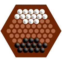 The board consists of 61 circular spaces arranged in a hexagon, five on a side. Each player has 14 marbles that rest in the spaces and are initially arranged as shown below, on the left image. The players take turns with the black marbles moving first. For each move, a player moves a straight line of one, two or three marbles of one color one space in one of six directions. The move can be either broadside / arrow-like (parallel to the line of marbles) or in-line / in a line (serial in respect to the line of marbles), as illustrated below.[2]