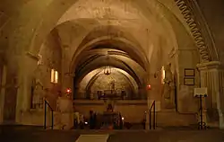 The crypt, or lower church, dates to the early 11th century. It measures 50 by 25 meters, and occupies the whole subterranean section of the nave. In its center is the tomb of St. Giles, a medieval place of veneration until in the 16th century, his relics were moved to the Basilica of Saint Sernin at Toulouse. The upper church, with a nave and two apses, mostly belongs to the 17th-century reconstruction, aside from the massive pillars in Corinthian style.