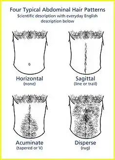 - Acuminate: Characterized by a tapered, inverted 'V' pattern extending upward from the pubic hair. Upper limit may end below the navel, at the navel, above the navel or near the chest.[1]