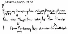 Under a heading ABECEDARIUM NORD, the manuscript presents the Younger Futhark in three lines. Linguistically, the text is a mixture of Old Norse, Old Saxon and Old High German. It is probably based on a Danish original, maybe imported from Haithabu to Lower Germany, and adapted to the idiom of its recipients. The background of the Carolingian notation of Norse runes is that of intensified contacts between the Frankish Empire and Denmark which necessitated interpreters for economic and political exchanges.