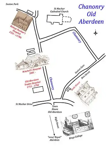 - NB – by this time David Mitchell had founded his Hospital for "Auld Maids" in Old Aberdeen. Further, the Trustees of Bishop Dunbar’s Hospital (1531) then located in Don Street, Old Aberdeen also began to use their income to support Bedesmen in the community.